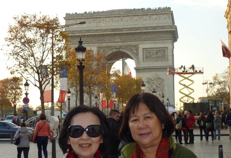 陳淑萍和韓蓮美以紀念拿破崙,在1805年12月2日大敗奧俄聯軍而建設的凱旋門為背景的合照。