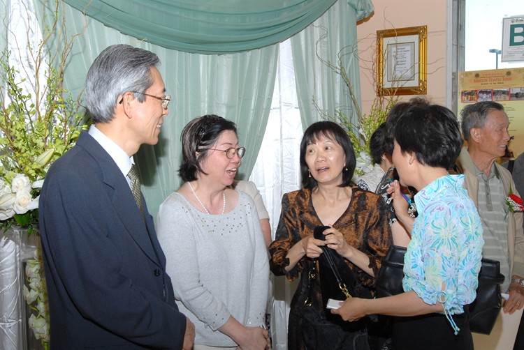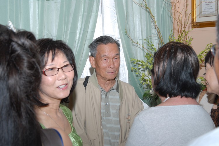 #85 69年畢業校友張麗桃朱景光伉儷向梁景輝老師問候。旁邊是廖錦雲老師與謝燕媚(69年畢業生)