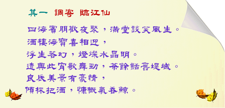 以下是畢日勝學兄的自序: 2012年聯歡會 詞二闋 公元二零一二年啟智校友聯歡會 序: 公元二零一二年五月廾六日,壬辰立夏,智校友聯歡會設宴於南加州蒙市海寶酒樓。宴開四十餘席。師長同學嘉賓,來自亞歐澳及美加各地,逾四百餘人,濟濟一堂,座無虛席,盛況空前。是夜也、桌上醇酒珍饈,台前卡拉伴唱,西樂洋曲,北調南腔,笙歌妙舞,熱哄廳堂。有此良宵美景,師友同學久別重逢,乃葉強, 陳少珍, 姚彩虹,馮學華, 王小筠,及梁達邦諸君不遺餘力,熱心籌辦之功勞。填詞二闋,以紀盛事,以遣余懷。