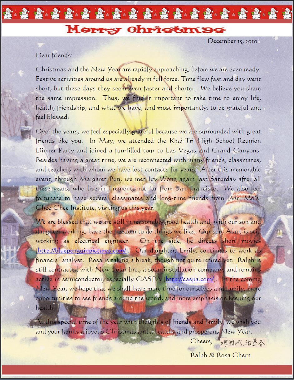 Greeting from Ralph & Rosa Chern 陳國城 & 張蕙芬(69年文科) Dec 15, 2010