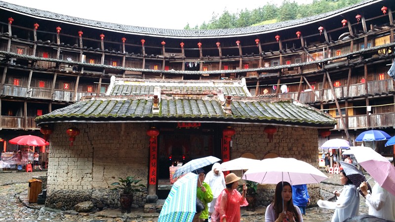 這就是所謂的土樓,土樓有何特別之處呢?話就長了。土樓的起源要追溯到唐朝時代,兵荒馬亂,人民遷徙,為了自保,他們建此土樓,用以抵禦外侮。他們用此地特有的泥土,建成一座座的土樓。高大的土樓只有一個出入口,當樓門關上了,敵人無法攻入。裡面住上幾十甚至幾百戶人家,底層都是廚房,對外沒有窗門的,第二層是貯藏室,對外也沒有窗門,中間圓圓的天井就是光線的來源。底層的廚房裡都有一口水井,以供洗漱與食用。