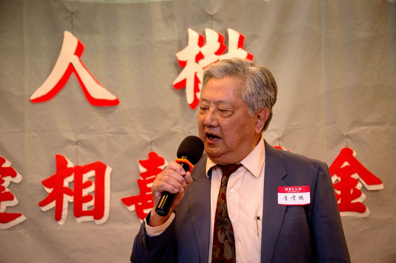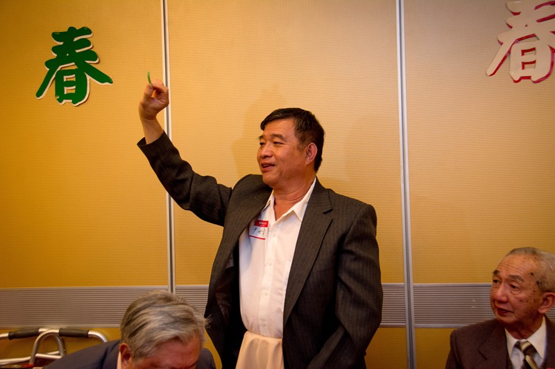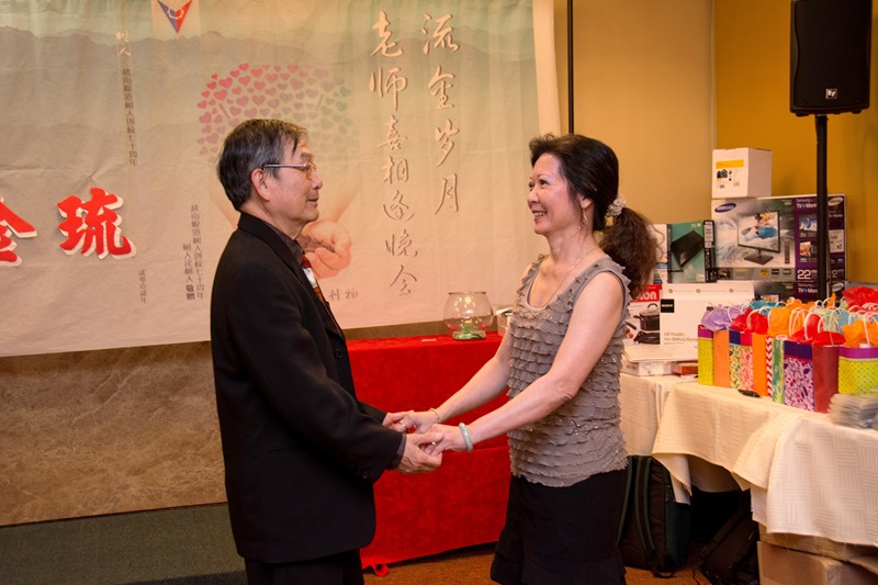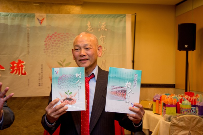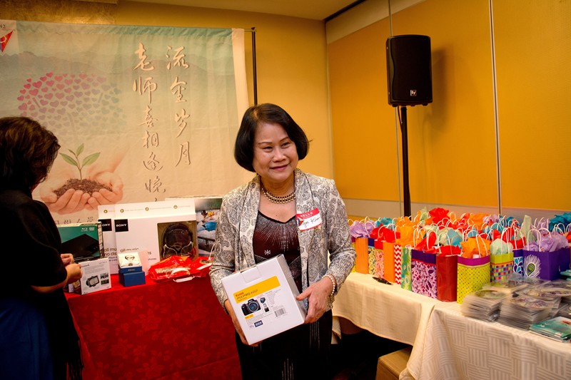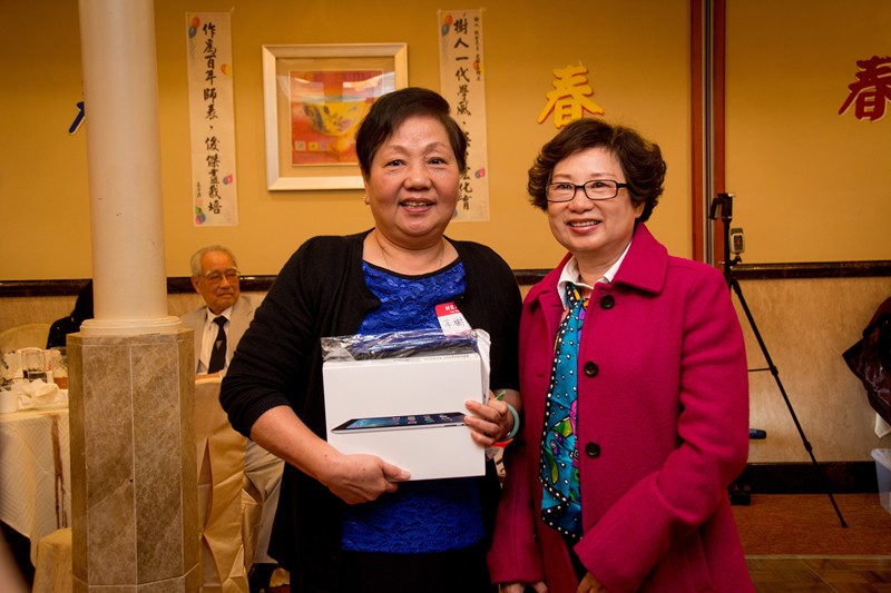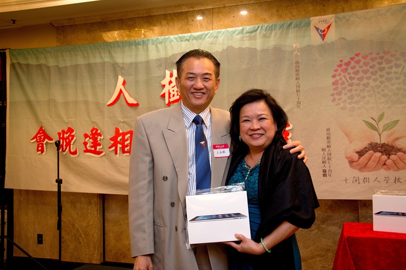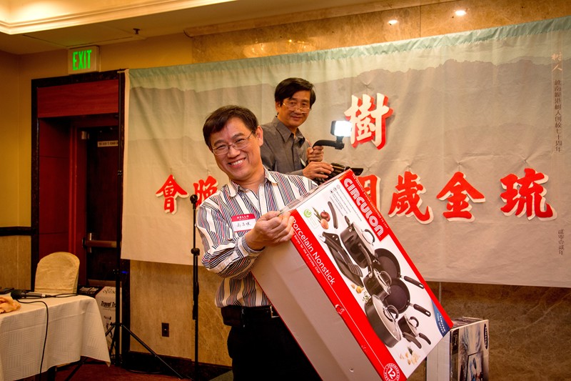 老來光老師中獎,選擇頭戴耳機。編者在樹人唸小學時,老來光老師曾教過越文,如今已五十多年未見面了,可以說是恍如隔世。