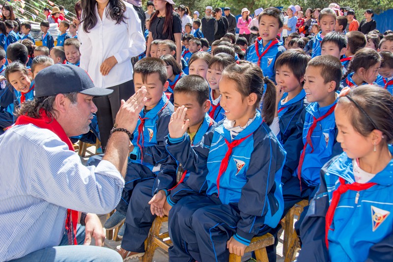 黎美顏老師與樹人小學老師們握手言歡,她們是回民,因此頭上戴著布帽遮住頭髮,這是回民的傳統服飾。
