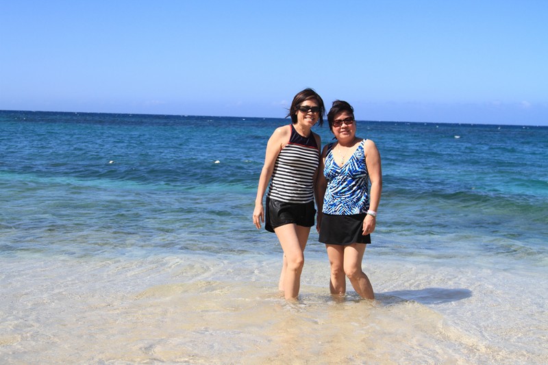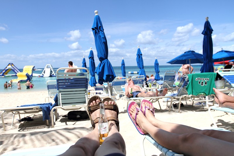牙買加啤酒,任你喝,免費。看到海水裡的白色浮標嗎?不能游過那浮標,危險!