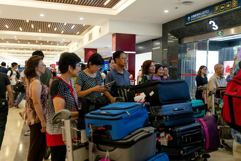 從廣州到海口,導遊楊振(右穿綠衫者)點名,就怕漏了一個回到旅館還要返回機場尋找。