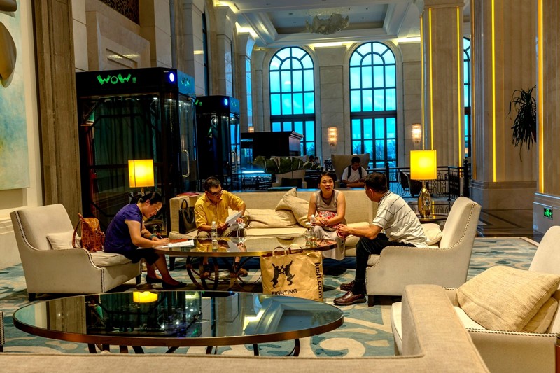 魏洁、王秉國、汪沁筠、王永健,我們在酒店大廳商討第二天的海南文祥樹人小學校舍落成典禮事宜。