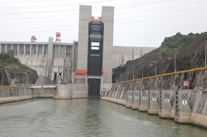 閘板開始上升到頂部,電梯裡的水被封了,不能往外流。然後電梯開始下降到大壩另一端比較低的水平面,大約幾百米的高度。