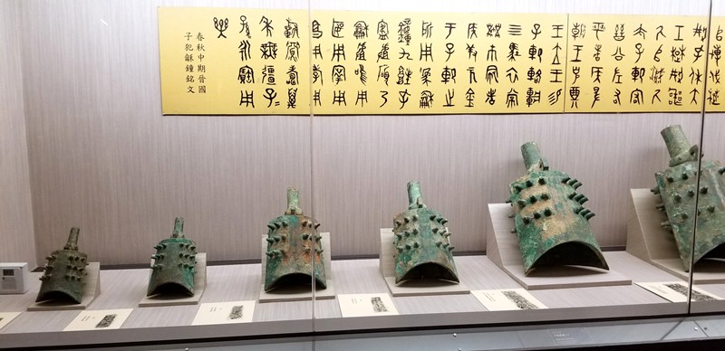 西周晚期『編鐘』:編鐘是中國的傳統打擊樂器,始於青銅器時代。由青銅鑄成,它由不同的鐘依照大小排列,並懸挂在一個巨大的鐘架上。編鐘常與編磬組合使用,“金石之聲”中的“金”就是指編鐘,“石”指編磬。