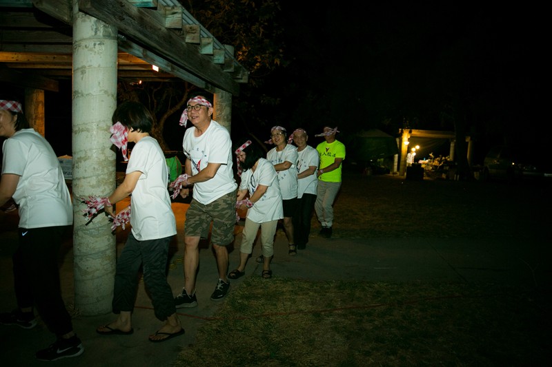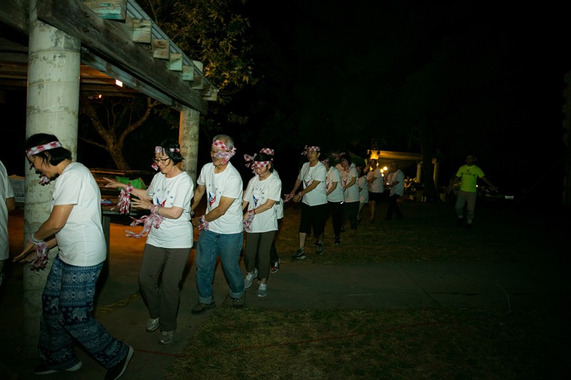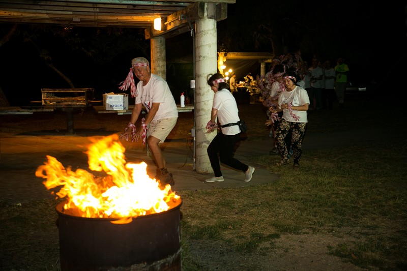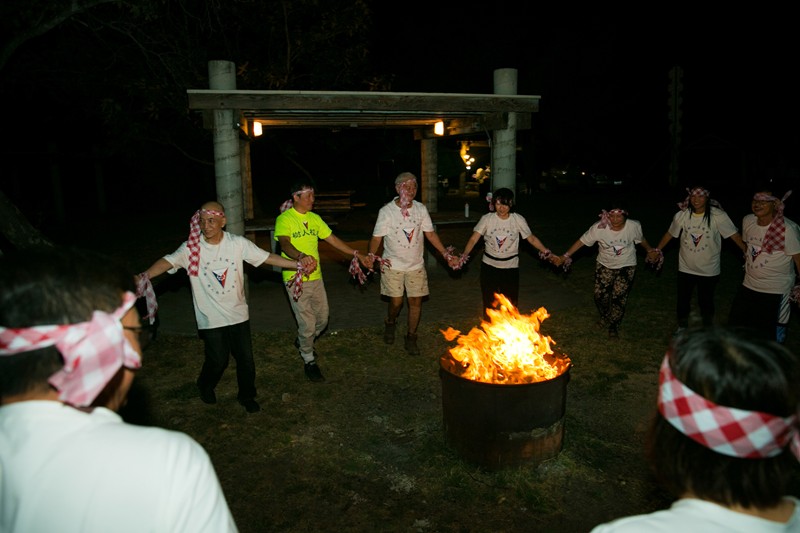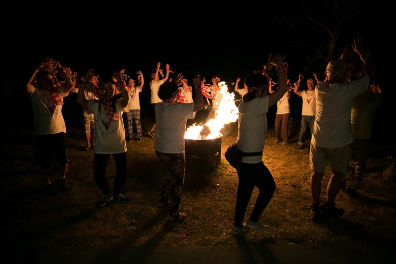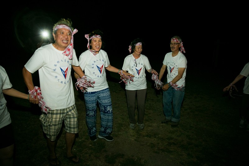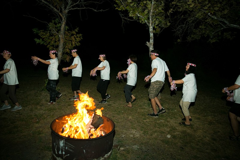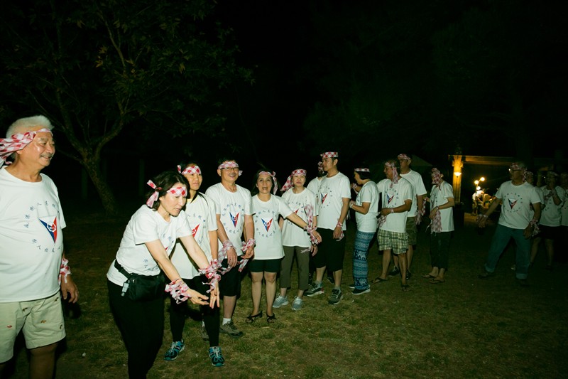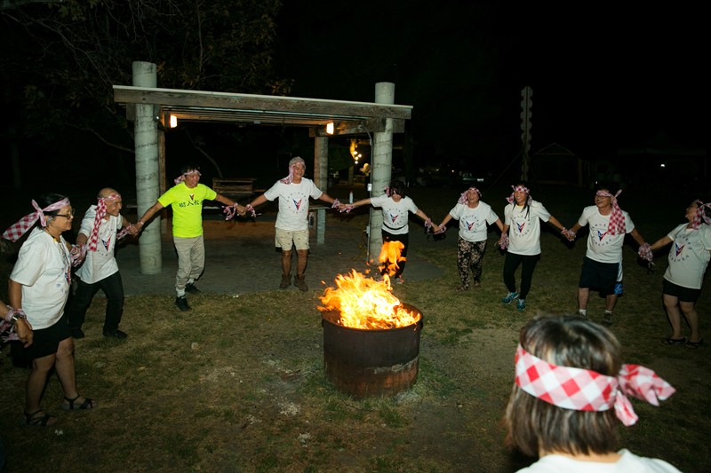 shirt, 每人頭上都圍着彩巾,驟然之間都化身成為山地民族. 隨著樂聲的激昂節奏,我們手牽着手,踏着輕快的脚步, 又唱又跳來到繎燒中的營火,