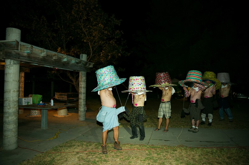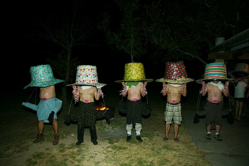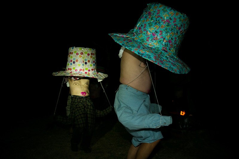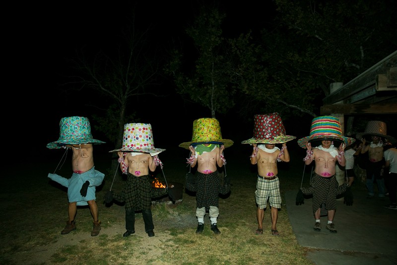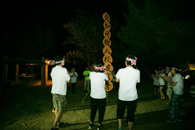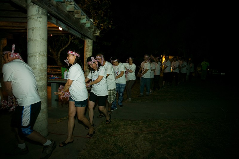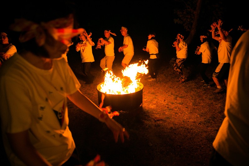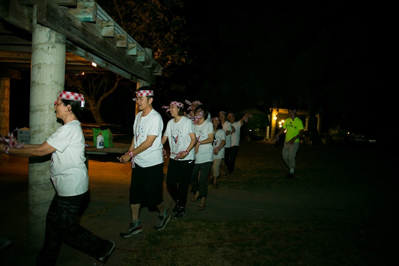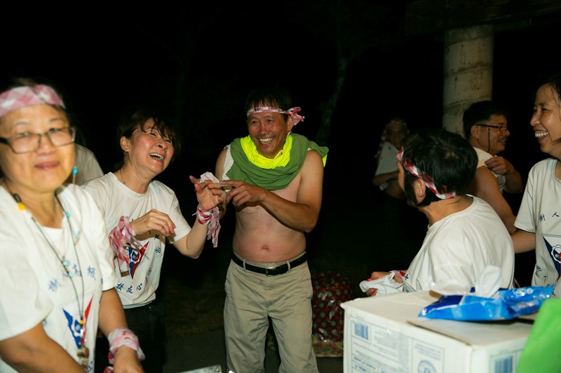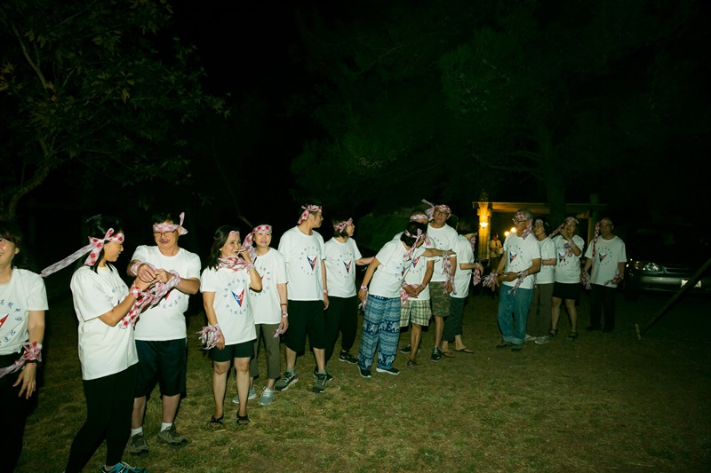 shirt, 每人頭上都圍着彩巾,驟然之間都化身成為山地民族. 隨著樂聲的激昂節奏,我們手牽着手,踏着輕快的脚步, 又唱又跳來到繎燒中的營火,