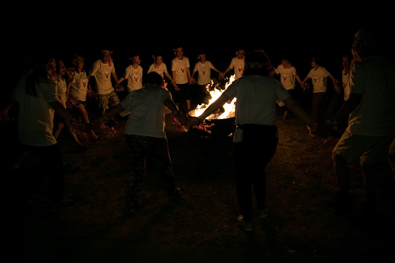 圍繞在營火的四周,形成一個圈圈.熊熊烈火把每一個人的臉龐映得通紅, 激盪着我們狂熱奔騰的心. 此時此刻,月光之下載歌載舞的我們,