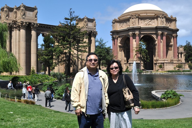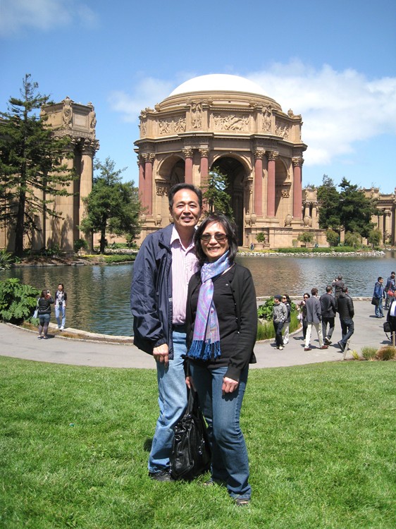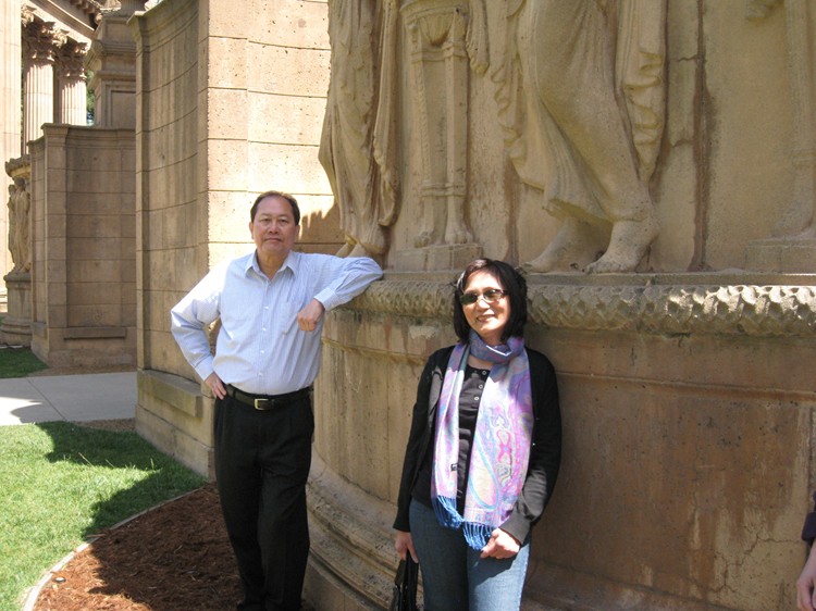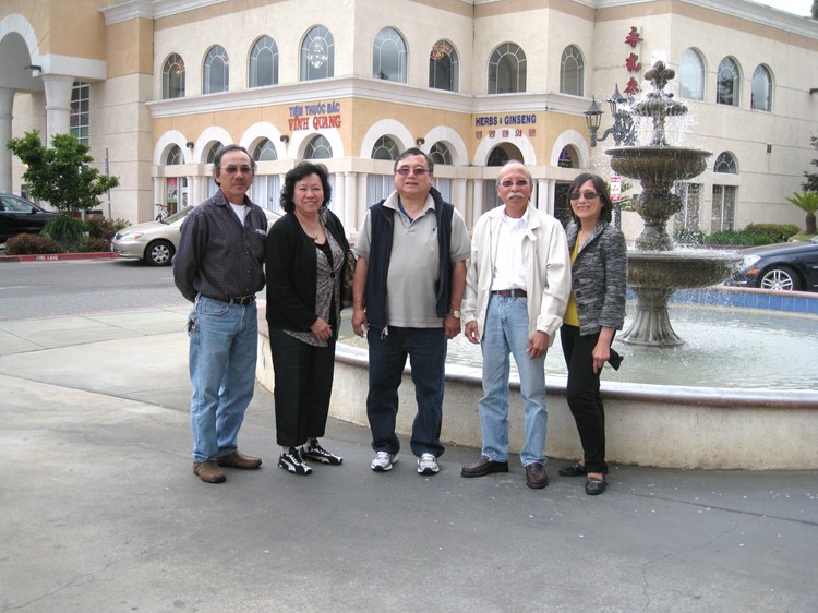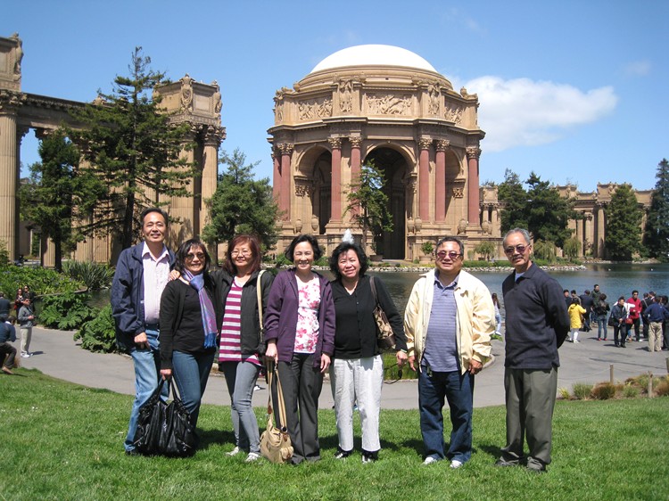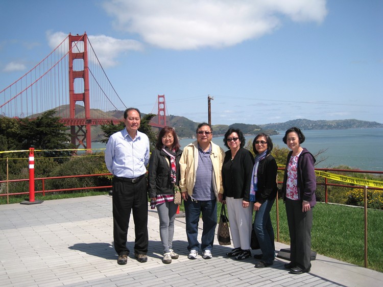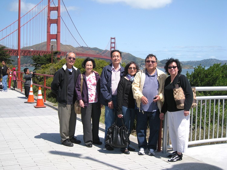 洪德恩伉儷探訪三藩市,杜碧珠伉儷與幾位斌社班同窗陪同前往三藩市各景點遊覽。 三藩市金門大橋前:蔣志昌、李艷芳、洪德恩伉儷、杜碧珠、譚美珠。