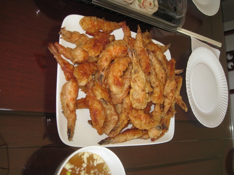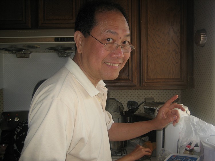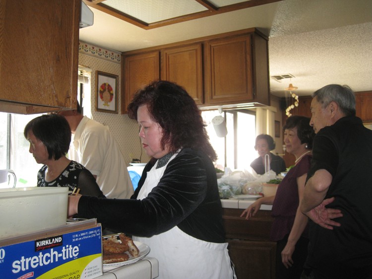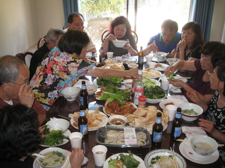 想必為了珍惜這份幸福,大家不計個人得失,全力付出,以求聚會一如以往般,圓滿劃上句點。此次志昌大顯身手,泡製改良式的 Mi Quang,以示對這位來自小城會安的姑娘帶來一絲家鄉風味。除了沿用傳统式 Mi Quang必備的鮮蝦,猪肉,配上原本口味的大量蔬菜,花生,炸蝦餅等之外,他選用了另一種不必加上色素,較為爽口的麵去料理,除了保持 Mi Quang原有的家鄉美味,食用之時,口感更佳,志昌的求新創意,可圈可點。麗萍則包辦了 Bun Thang,炸蝦,煎魚。。。等各項美食,纯熟手法,頗有大厨之風。璇珠夫婦則送上親自料理,清香可口,補身養顔的龟岺膏,以作餐後甜點。碧珠與強哥則整日忙裡忙外的,又是厨房,又是客廳到處張羅奔走,又是咖啡,又是红酒,又是水果,又是红豆沙,忙個不亦樂乎,真讓我們個個看在眼裡,銘感心中。美珠夫婦,艳芳夫婦亦一如既往般對老友們義不容辞,熱心参與大小事項,有忙即幫,二話不說。文錦於百忙當中,於午後亦携帶兩位女兒來到加入我們,雖然來去匆匆,却也儘可能不予缺席。遠在 San Diego的英敏亦在我們的聚會當日來電與同學們遂一問候交談,同窗情誼,平淡之中顯現其難能可貴。