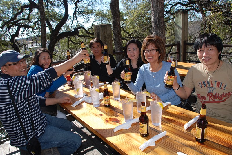 德州人很怕冷,當天由氣溫大約相18-19度,餐廳裡頭還旺旺的燒了一爐的火,心想要是坐裡頭的話,說不定成了烤鴨,還是坐外邊的好.聽小妹說這裡的黑啤酒好,我叫了一瓶叫Shiner的黑啤,果真好喝。吃過午餐回到車上,大家都覺得倦了,一一入了夢鄉.醒來時已經到了休士頓。