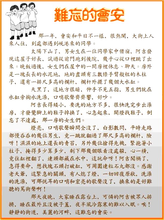風雨中的後街虚幻迷離 , 街的積水不断湧入校内 , 如滔滔江水遶着球場奔流 , 好不容易才來到學校後門外 , 脚丫都被激流冲得又痛又癢 ,