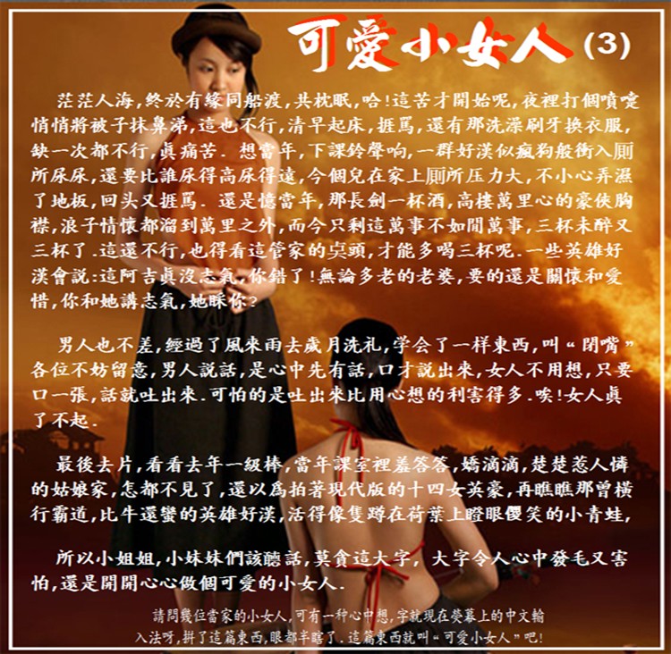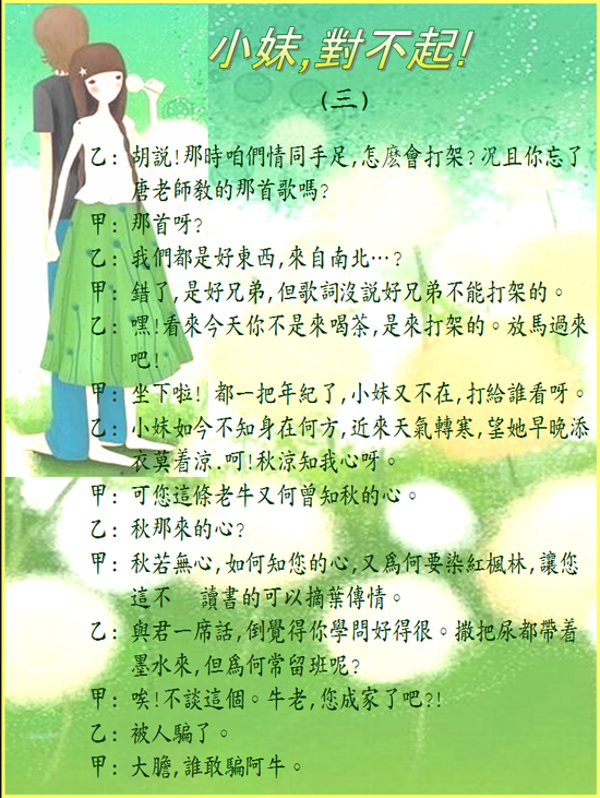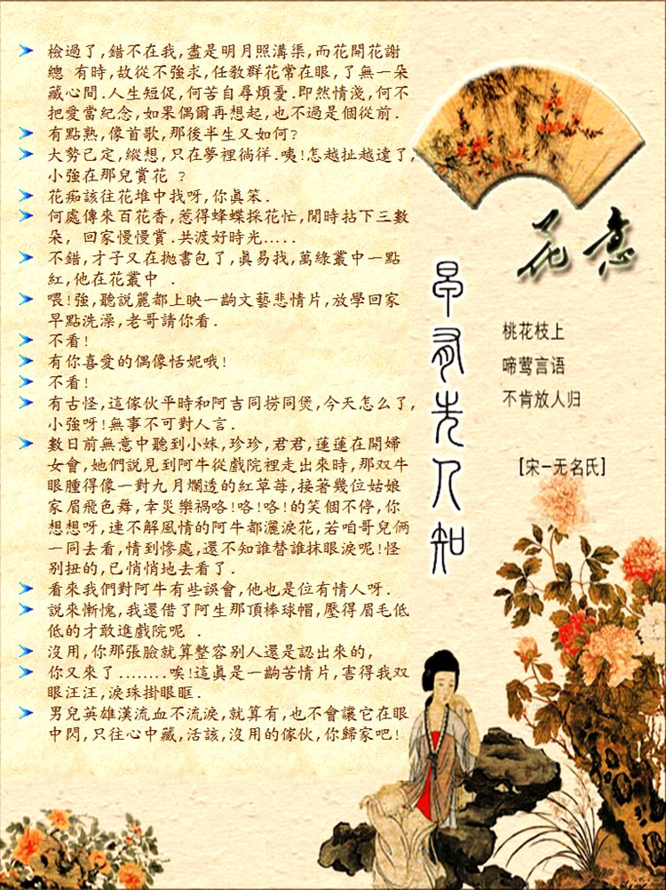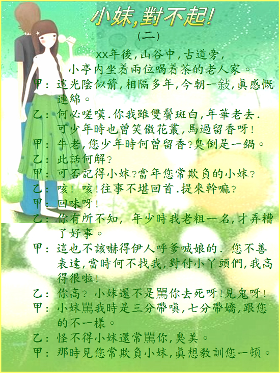 塵世間不如意事常八九 , 此話確實不假 , 大人站着不出聲 , 小的不敢問 , 濕漓漓的衣服黏在身上好難受 , 時間更如脚下流水 ,