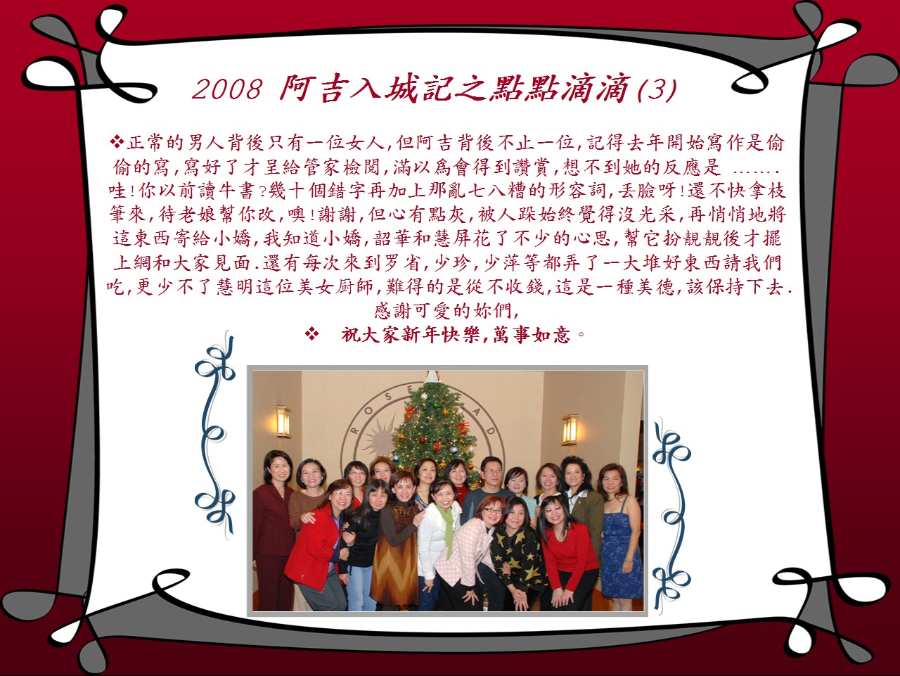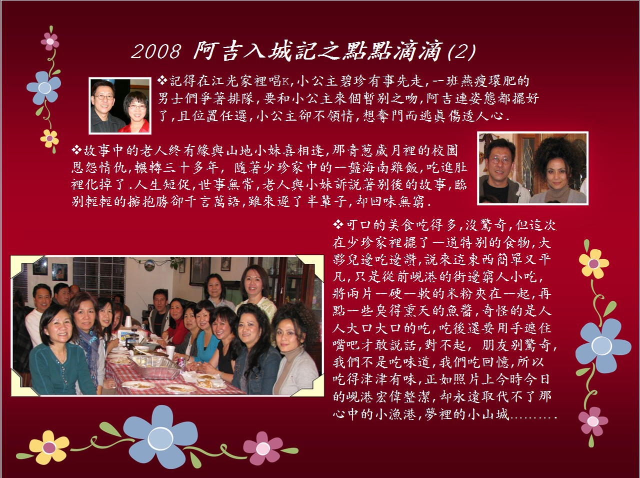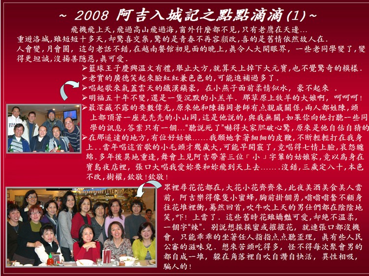 ….. 小子特意在爺們桌前瀟洒轉一囘 , 咦 ! 怎麼連個招呼都省了, 莫非夜裡礼堂太暗 , 幾位爺視力欠佳認不出眼前人 ? 两場歡喜两場空 ,
