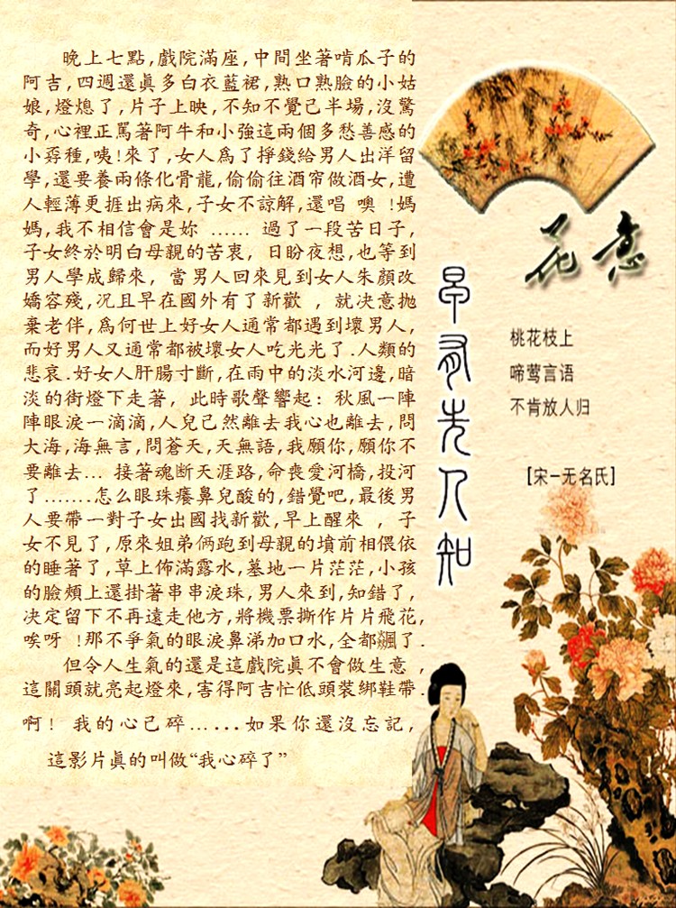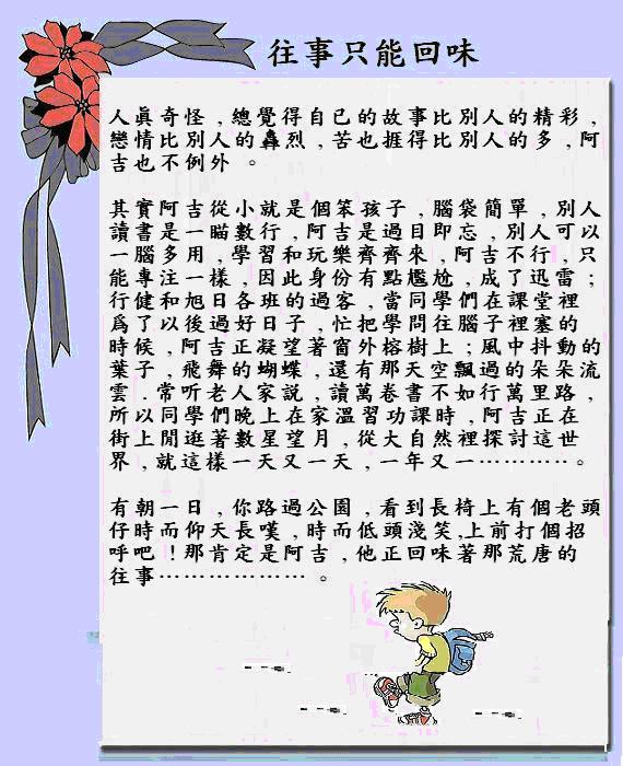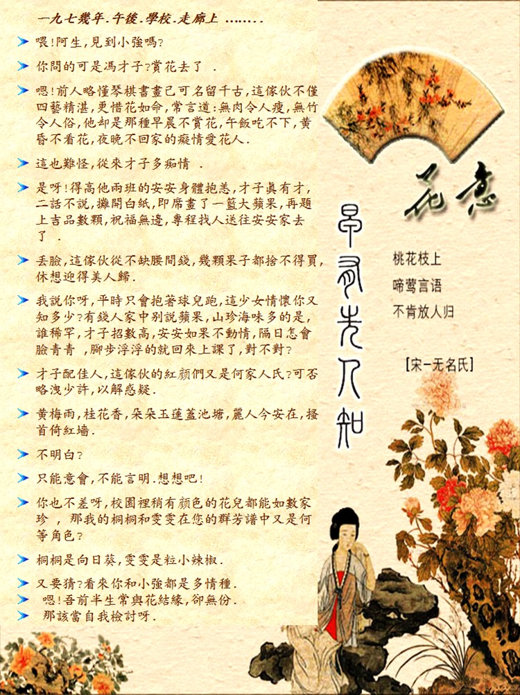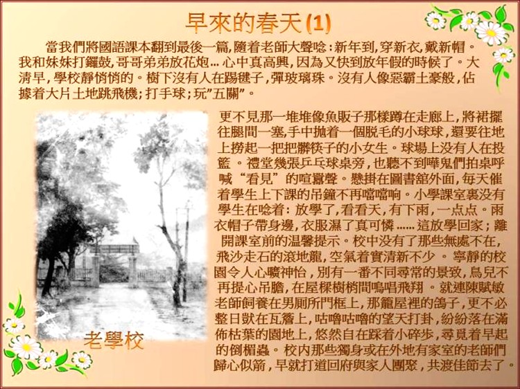 斗室内數隻小飛虫繞着吊燈圑圑轉 , 還笨頭笨腦撞得燈泡叮叮响 , 昏暗的燈光下 , 俯在桌上的小子用心背着書 : 天這麼黒 , 風那麼大 ,