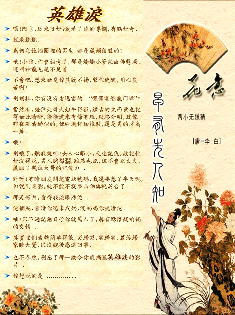 遙遠的六十年代 , 一個早己湮沒了的晩上 , 那没頭没尾的對話 , 竟然在今天的無間道電影 , 電視劇裡出現又出現 , 重覆又重覆 .