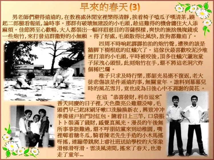 。。 。那一班的學子冒著火紅的太陽 , 在暑假回學校做苦力搬水泥 , 還將學校的樹掛滿了千百條銀錫帶 , 風起時沙沙作響 ,