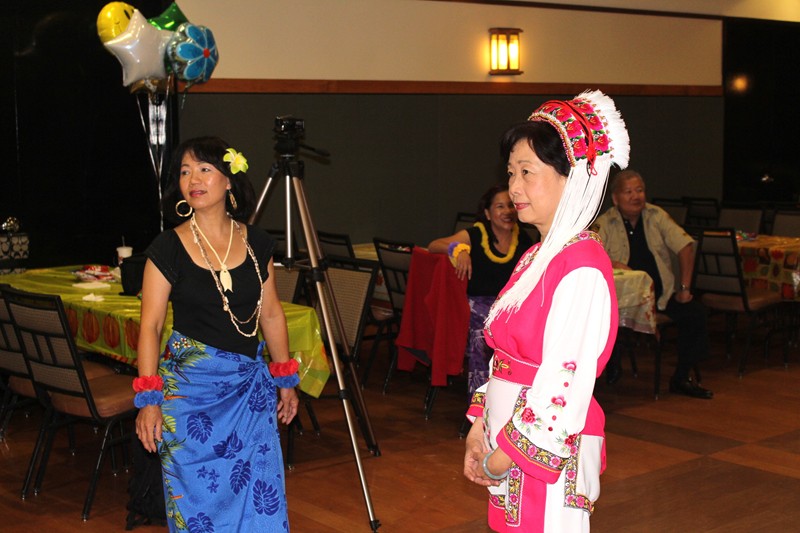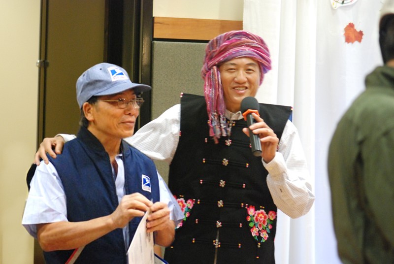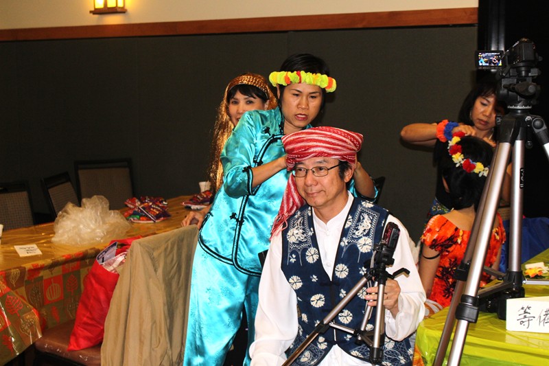 這個人是誰呢?Cheech & Chong 喜劇裡的 Tommy Chong 扮相。他敲門進來時我們不知道是誰邀請來的客人,他就站在會場的一角靜靜的看着我們唱歌、拍照,一聲不響。由於籌備組成員所邀請來的賓客我們都不全認得,我們懷疑此公來吃『霸王餐』,不請自來,就查問門票,若沒門票,『請自便!!!』,這位 Tommy Chong 說是編者王永健邀請的,編者仔細的打量之後問:『Are you。。。?Anh là 。。。? 你係邊個?你是誰?。。。』由於不知此公說何種語言,就用四種話問,結果我們終於認出『她』是誰,原來是王永康的老婆、編者的弟妹:老。。。亮。。。祿!!!