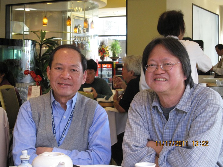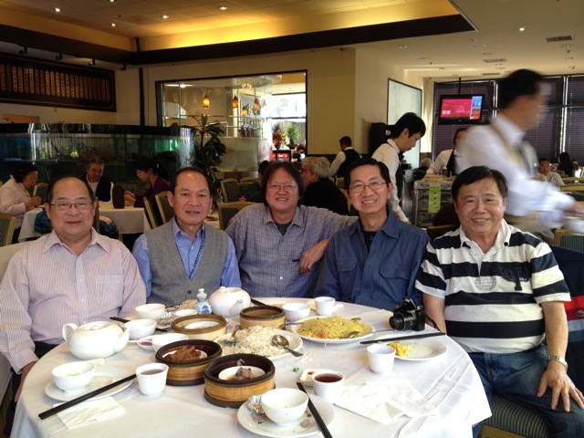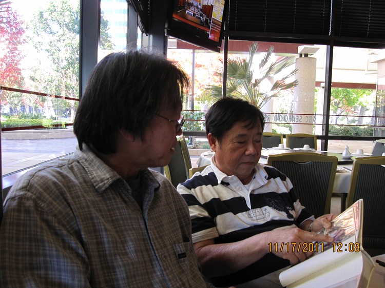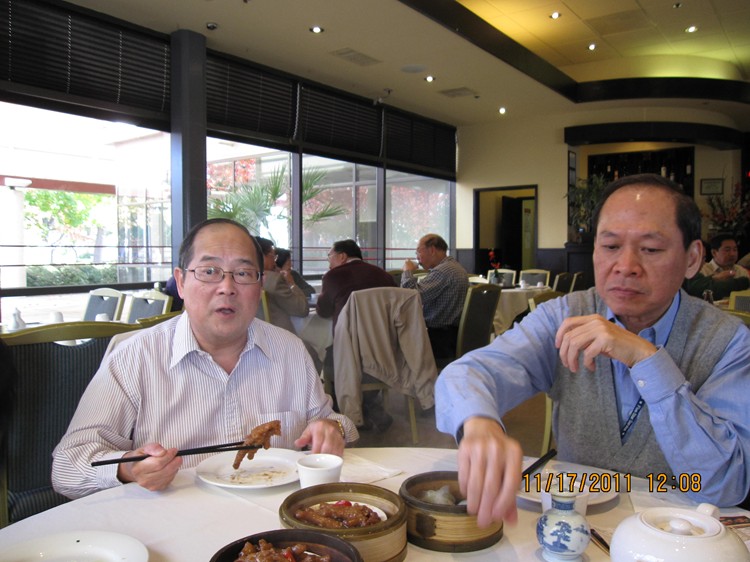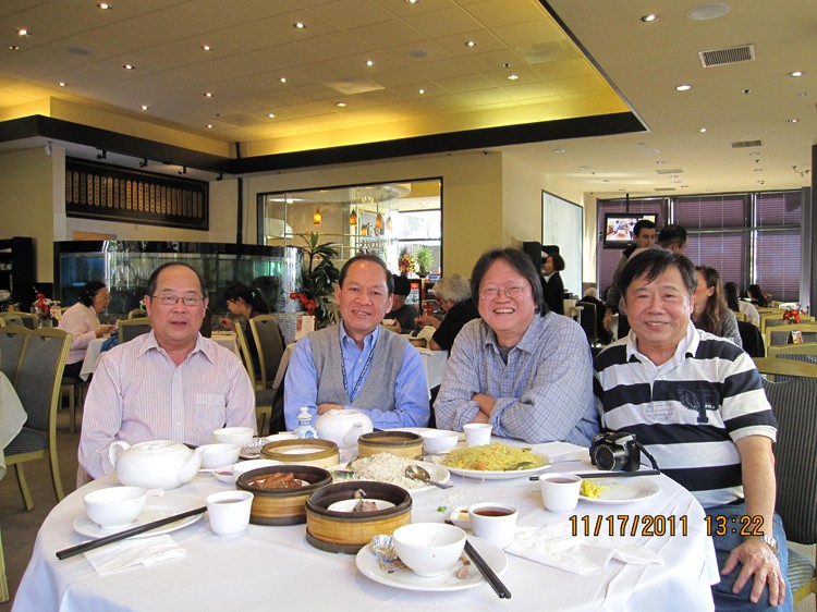 他乡遇故友 :人生三大乐事之一。葉偉、許慶炕、黄建明、黎永恩、陳宏光,茶楼小叙于加州弯区,攝於2011年11月16日。