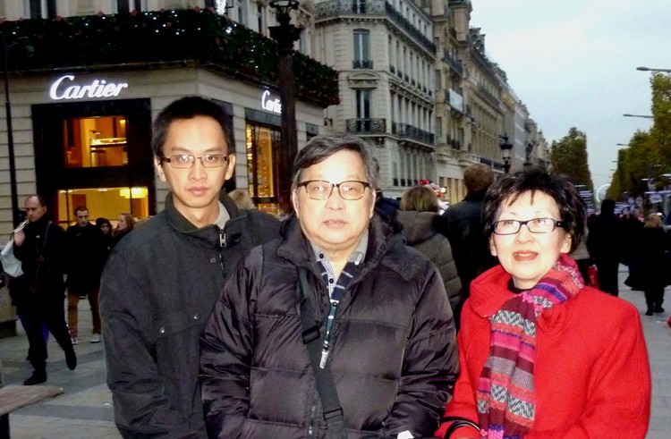 洪佳的姨甥 Christian(左) 一直沒有出鏡,現在也樂於和舅舅及陳淑萍,一起在遊人如織,兩旁是候斯曼式建築物的香榭麗舍大道上合照。