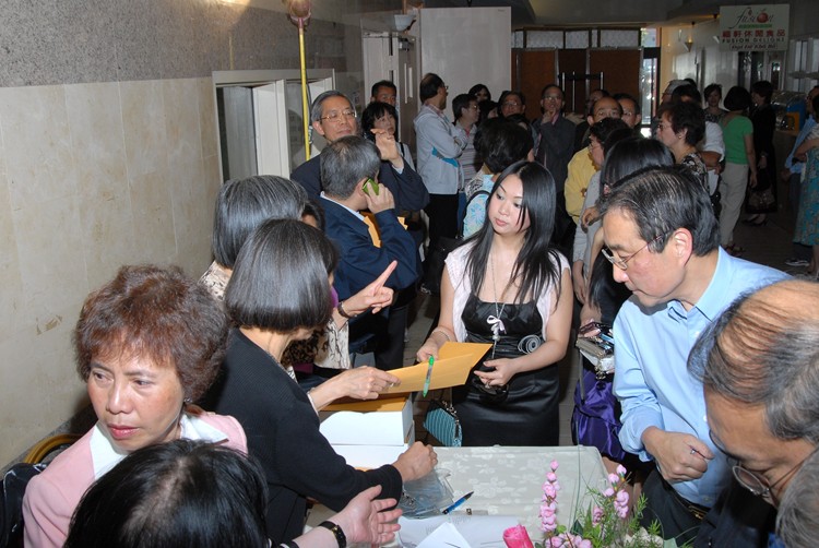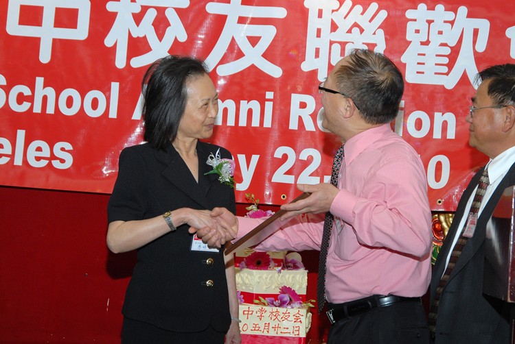 #91 1969年畢業校友韓蓮美代表大會贈送紀念獎牌給梁景輝老師。韓蓮美校友是此次聯歡晚會的發起人與主持人之一。