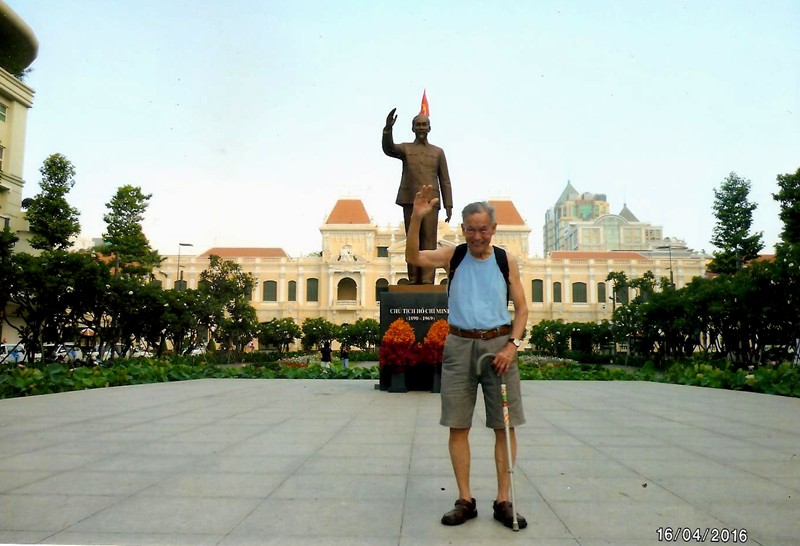 梁老師在4月份逗留堤岸的時候,儘管氣溫炎熱,每天卻沒有放棄,散步鍛煉身體的習慣。清晨一早趁著氣溫尚未升高,老師趕搭巴士到西貢第一郡,在新開闢的寬闊與整潔大道上健行。4月16日,老師漫步到胡志明銅像前,模仿這位前越南領導人揮手的姿態!