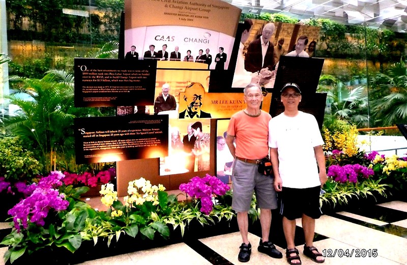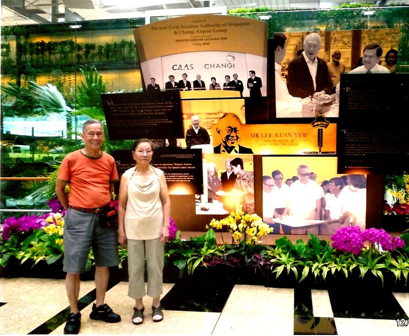 4月12日,新加坡樟宜國際機場,梁老師和師母在佈滿蘭花和熱帶植物,紀念已故李光耀總理的圖片展覽廳內合照。