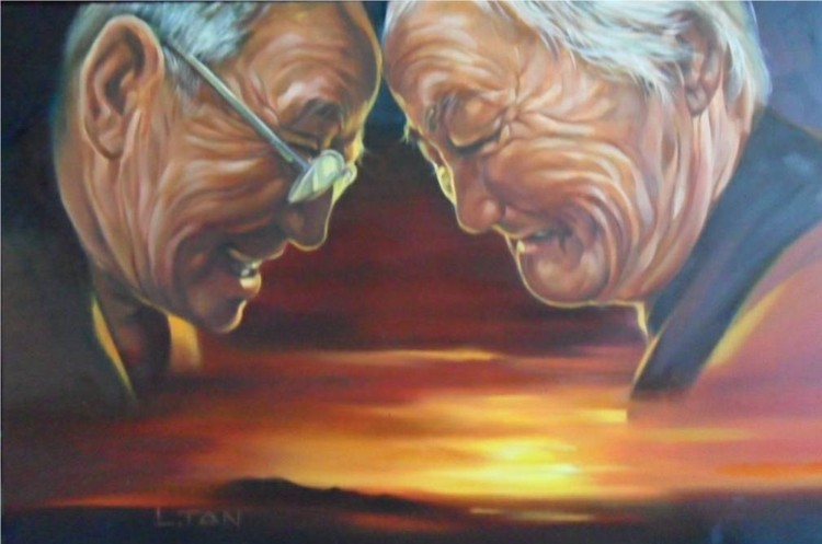 月前世界日報報導﹕中國民政部提供數據,今年一季度,全國有46萬5000對夫妻勞燕分飛,平圽每天有5000對夫妻離婚,離婚率是14.6% 「今天,還能相信愛情嗎?」近日在網上瘋傳的這句話,讓人傷感,讓人困惑‧‧‧‧ 報上文字側邊,有意地登上一對老夫老妻老來恩愛鏡頭,我受這照片感动,繪成油畫,畫幅下面加畫殘陽暮色添增意境。 時代不同,婚姻觀念在变,两情相悅再難得天長地久,一言不合斷然分手。需知漫長姻緣路殊多風險,艱難如過重重関卡。我們為了家愛孩子,萬事吞到肚子又何妨。(大肚能容,容天下難容之事)。