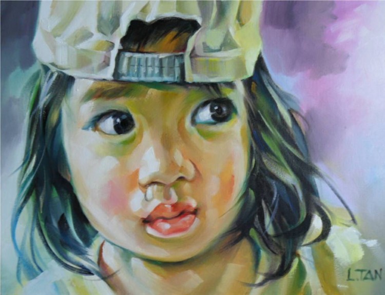 在後園玩了半天,見她滿頭汗,帽歪涕流一身髒,我即用相机拍了她的流氓樣,再繪成油畫,用透明膠塗在鼻涕處變立体。當她見到畫時,氣急地問﹕「阿公,為什麼要畫我的鼻涕?」 我摟着她,親她的臉說﹕「因為妳是可愛的鼻涕蟲!」