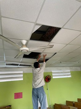 日前母校課室於暴風雨中發生屋頂滲漏情況,校方立即委託造屋公司進行修補,首輪工程已按期完成。惟數星期後,颱風再度襲擊峴港,學校部分課室受強風大雨影響,出現「鉄皮屋頂下方的天花板鋼𢇁片(隔熱支撐構件)局部斷裂、天花板隔熱片脫落」等次生損害。