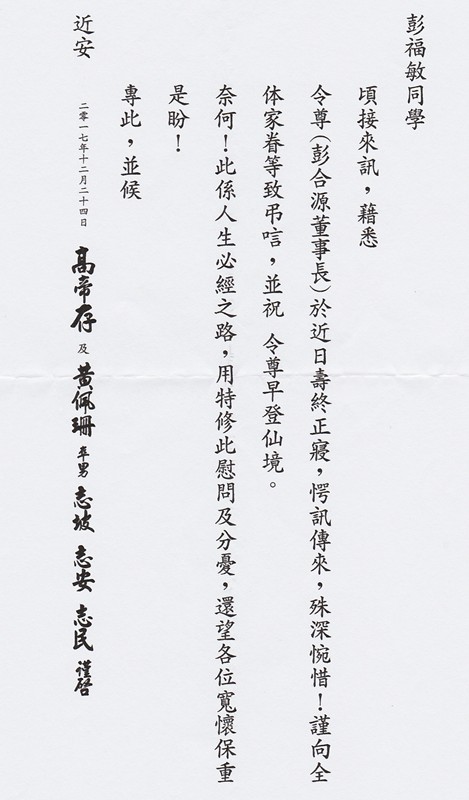 承蒙親朋好友,各屆同學慰問和祭拜。深表感謝。