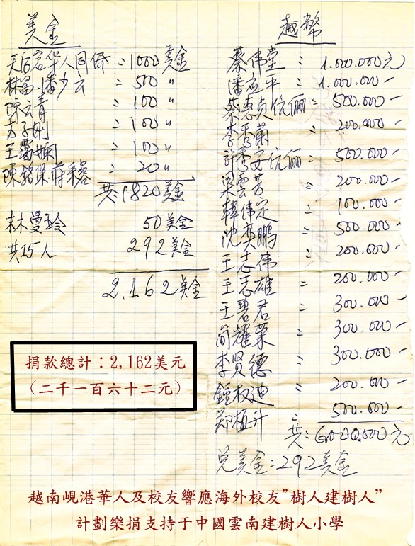 August 6, 2011 今收到 "越南岘港华人及校友响应海外校友"树人建树人计划"乐捐支持于中国云南建树人小学" 之捐款, 共美金 $2,162 元整。捐款由蔡惠貞學姊轉交 (見圖), 詳細捐款者名單如下: 峴港天后宮華人同僑捐一千美元($1000), 林富和潘少雲捐五百美元($500), 陳云青捐一百美元($100), 方子剛捐一百美元($100), 王靄嫻捐一百美元($100), 陳銘保和蔣采蓉捐廾美元($20), 林曼玲捐五十美元($50)。以下是以越幣捐款名單:蔡偉堂(1,000,000 dong), 潘應平(1,000,000 dong), 蔡惠貞伉儷(500,000 dong), 李秀蘭(200,000 dong), 許秀安伉儷(500,000 dong), 梁云芳(200,000 dong), 韓偉定(100,000 dong), 沈奕鵬(500,000 dong), 王志偉(200,000 dong), 王志雄(200,000 dong), 王碧君(300,000 dong), 簡耀榮(300,000 dong), 李賢德(300,000 dong), 鐘權迪(200,000 dong), 鄭植升(500,000 dong)。