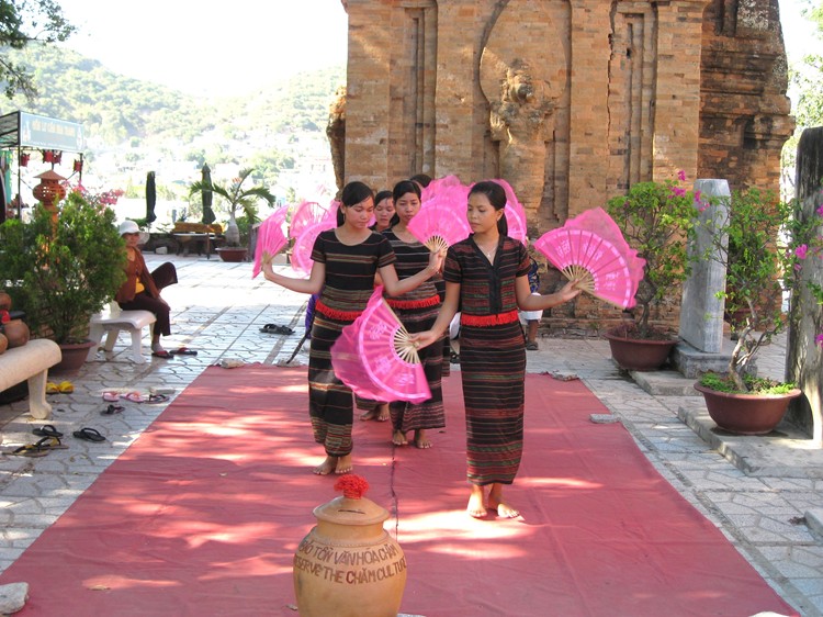 占族女郎娛樂遊客的扇舞,大瓶子蓋上的狹長小洞,即是放小費的地方,贊助保養博物館的費用。