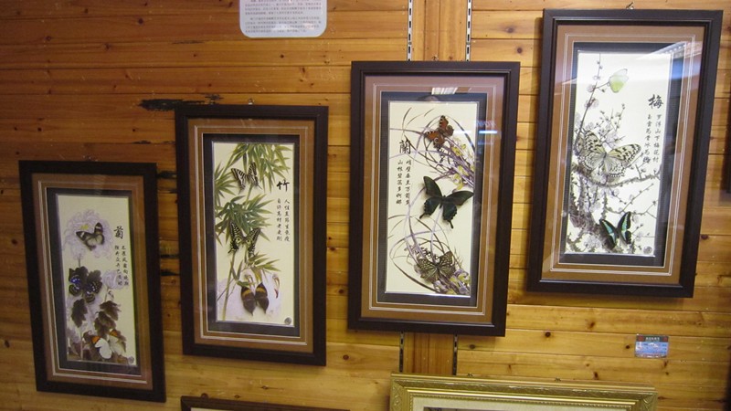 這一套有蝴蝶標本的梅蘭菊竹圖要價580元人民幣,大約93塊美金,價廉物美,我們的許多團員都買一套回家掛。