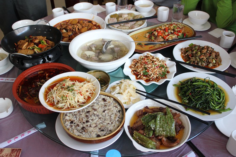 旅行社為我們安排的晚餐被取消,換上這豐盛的一桌菜。豐盛的食物只是其次,縣長親臨使我們盛情難卻。
