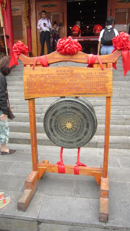 餐館前的銅鼓,以前鼓是用木做的,上有雕紋,然而時常敲打就會損壞上面的雕圖,後來才改成銅製的鼓。