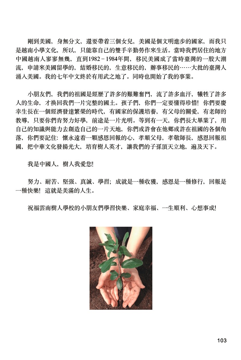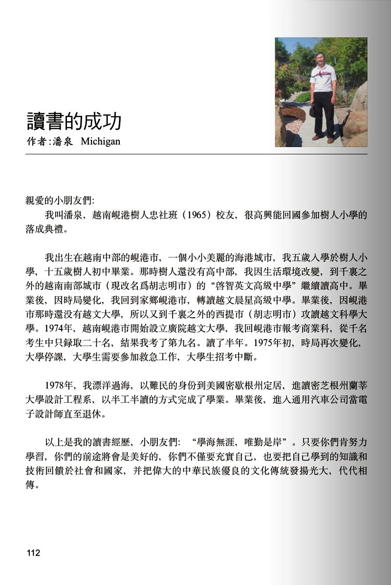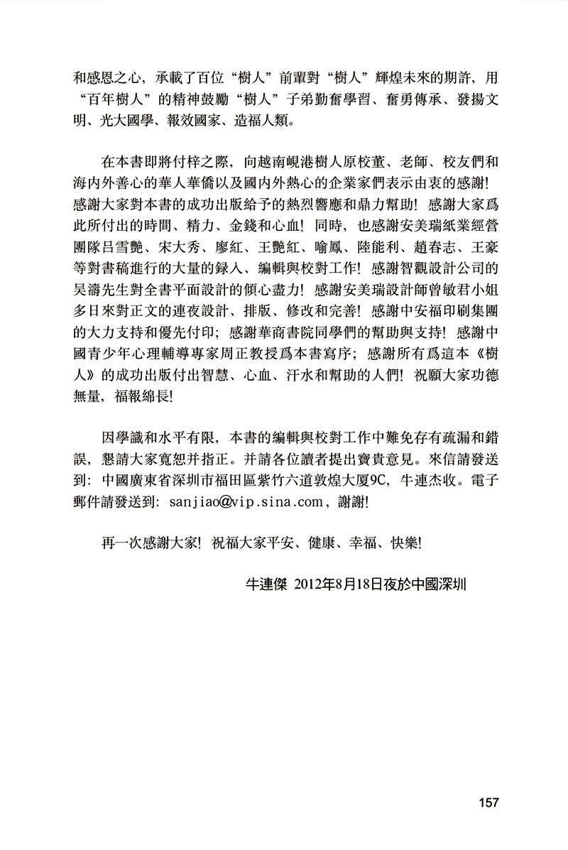 意想不到的是校友們對此構想的響應,寄來了上百篇文章,在葉李伉儷和他們在中國的友人牛連杰先生及他的許多朋友與旅居於加拿大萌社班校友李威博士的日夜不辭辛勞工作、校對、敦促、編排之下,這本書終於『美夢成真』的以簡體版翻印成小冊子,贈送給兩間樹人小學小學生們。我們在此給牛連杰先生及他的朋友們、葉茵萍、李廣茂伉儷和李威博士致上最真誠的敬意。