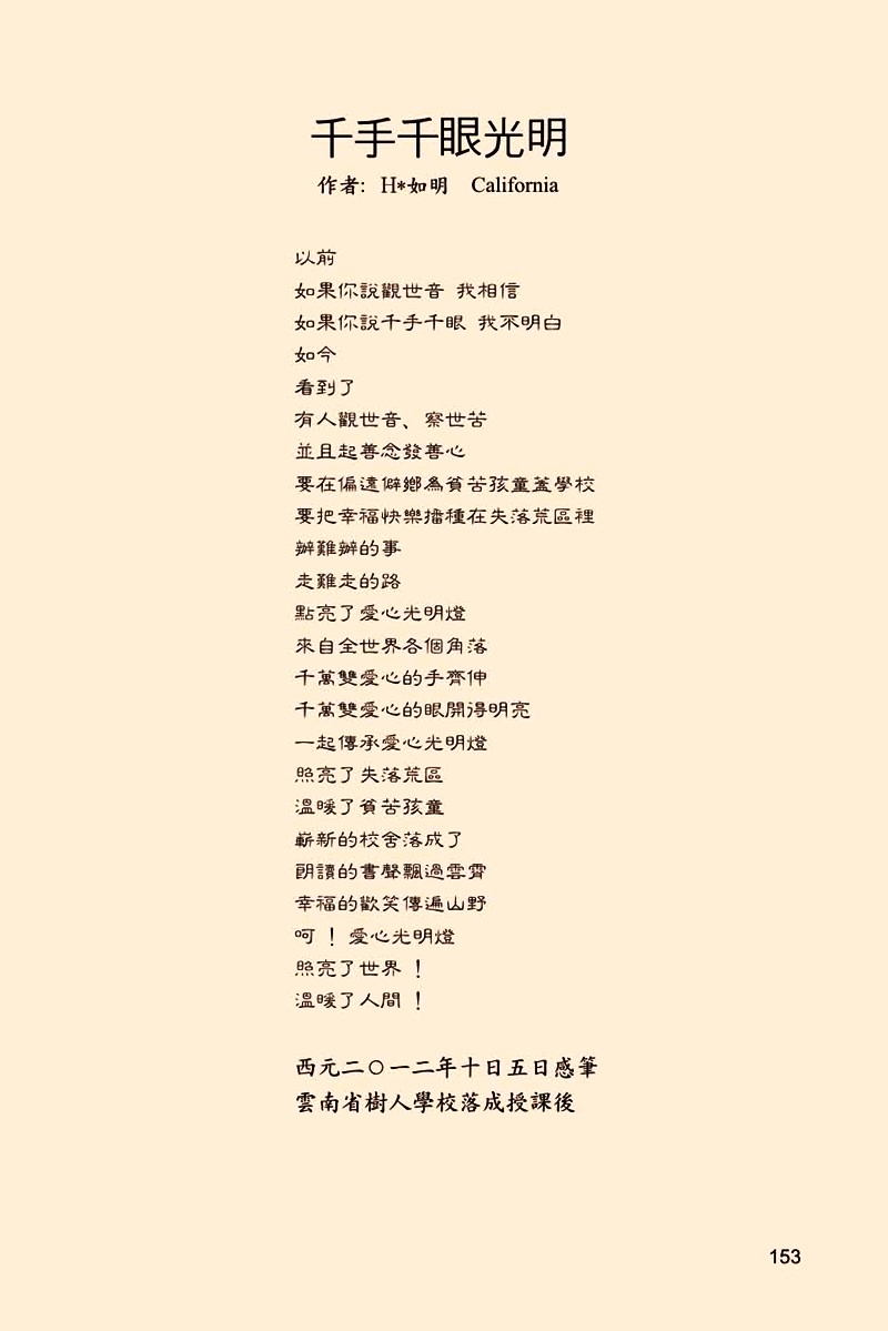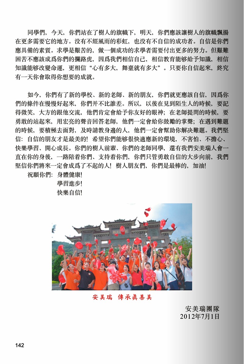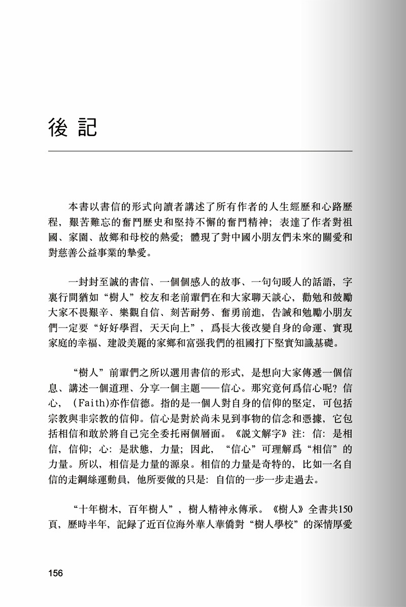 這本小冊子在初期的構思,到最後打印成書,是一個『美夢成真』的過程。『樹人建樹人愛心計劃』除了在中國邊遠地區捐助興建學校校舍外,也贈給孩子們書包,衣物、鞋子、文具、棉被、蚊帳、以及電腦、電子用品等一些日常不可或缺的實質用具與文具,讓孩子們有一個舒適的學習環境。『樹人建樹人愛心計劃』也沒有忘記贈送給孩子們精神上的禮品。忠社班葉茵萍、李廣茂伉儷的初期構思是呼籲校友們寫幾篇文章,告訴孩子們我們的一些人生經驗、奮鬥經歷、和處世做人道理、以及一些給他們的祝福與叮嚀。