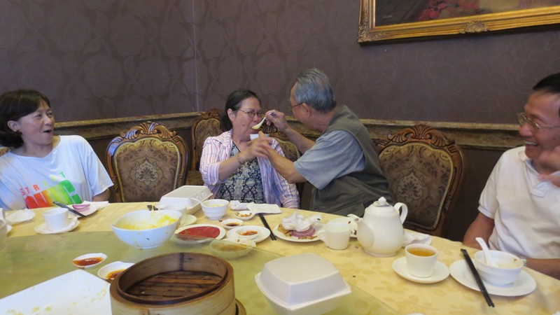 嘩!大庭廣衆劉師兄餵師姐!李美華的表情。。000沈雄洲的笑容更。。嘻嘻,原來這都是沈師丈的主意。他放一只筷子在茶壺上,然後打轉,停在誰人面前,那人就要餵旁邊的人一口南瓜粥,因為粥不可以打包,跟着選擇一合點心,劉師兄先拔頭籌,第一位中獎。