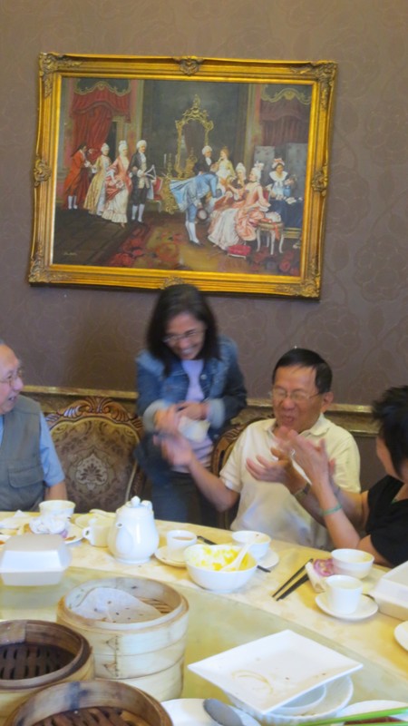 Stella 久居多倫多,因要最少一个半小時的等候,這次是頭一次來,所以也要和何春馨,余小玲(也是洪佳 (69)的好友),劉慧虹拍照留念兼感谢,另外一位忙着拍照的是郭夢雲師母的妺妹郭秀芬,從澳洲悉尼來,好欣赏多市的精美点心。