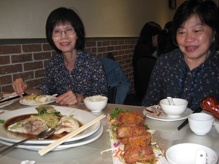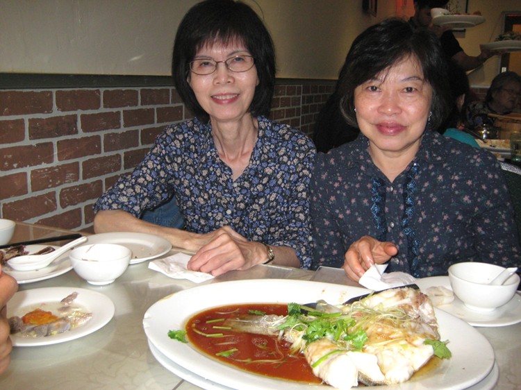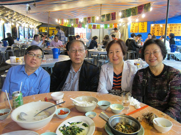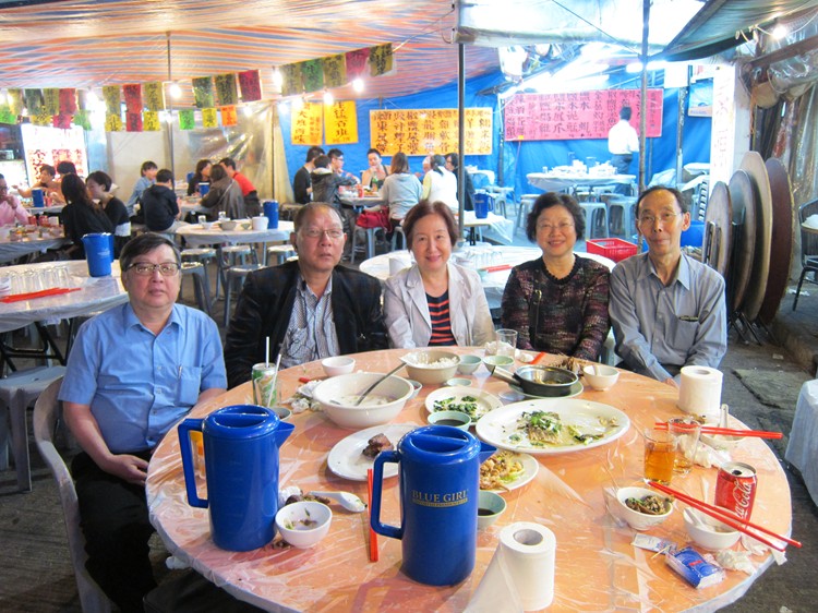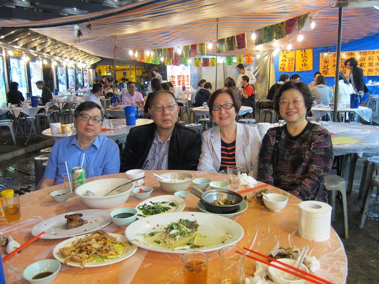 3月3日晚上,陳淑萍與住在香港的高中同學曾慧珍(站),黃克雄(站者),洪佳,劉桂寧及韓連美,在大排檔品嚐了清蒸鮮斑的可口晚餐。可惜拍照時,兩斤重的石斑還沒有蒸熟上桌亮相。多謝香港同學招待來自國外的同窗吃到了一頓道地的粵菜。