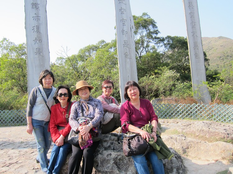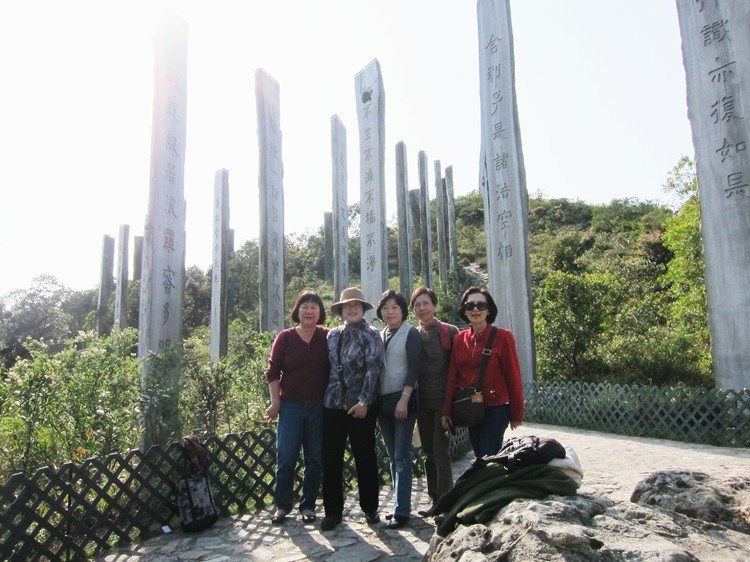 (右至左)韓連美、劉桂寧、曾慧珍與陳淑萍與在台灣認識的越南博愛中學僑生余小玲(站),暢遊大嶼山天壇大佛附近鳳凰山坡上的心經簡林。