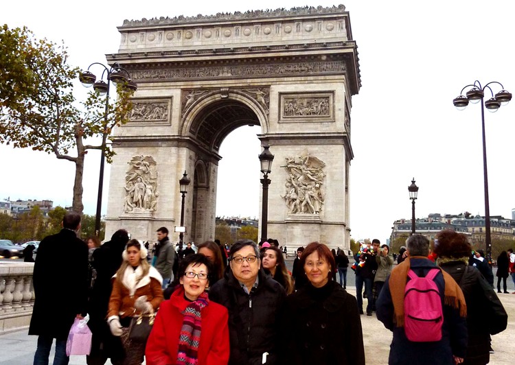 除了楊惠馨必須趕回家之外,黃美娟(右一)與陳淑萍(左一)陪伴洪佳 (中)乘搭地鐵,觀光巴黎市其中之一的名勝:凱旋門。在拿破崙時代興建的凱旋門,位於香榭麗舍大道最北端,車水馬龍的星狀廣場上。拍照後,大家準備沿着名店林立的林蔭大道,走到這條大街的盡頭。