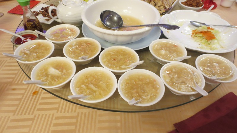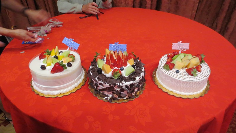 17 四月八日于海珍酒家設宴四圍枱,枱上那些红红精美的一包包,内是梁少娟從悉尼带材料耒到LA做的杏仁餅,由林露瑩, Pauline,
