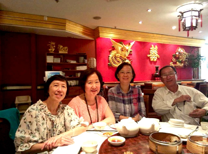 張惠民和梁少英親自到機場迎迓遠道而來的「稀客」後,大家一起去酒樓午膳,品嚐廣東點心。(左起坐)梁少英,顏秀慧,孫人先,人先大嫂。(後排男士左起)孫人先丈夫周永嘉,人先大哥,陳敬國。
