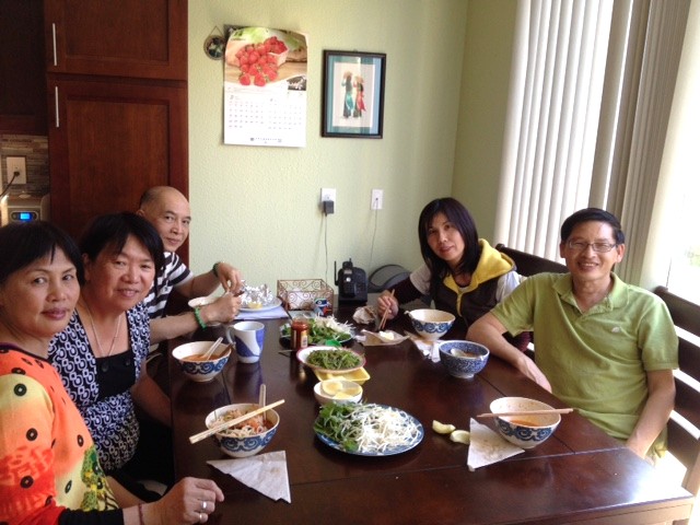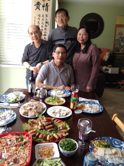 最近一次是慶祝李文羌與陳嘉齡之生日. (其中一張相片中坐著的那兩位), 後面站著的則是畢銀友夫婦, 小弟我與另一位 “啓智之友” 美華姐. 當日我們大家分工合作, “各顯神通”, 雖然七手八腳, 七零八亂的, 倒也還弄得出一桌琳瑯满目, 像模似樣的越式午餐, 但也不能吃得太多, 要留些肚子给晚間到餐館再嚐中式料理, 加上蛋糕甜點等, 想要減肥嗎? 過了當日再説吧!
