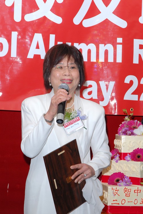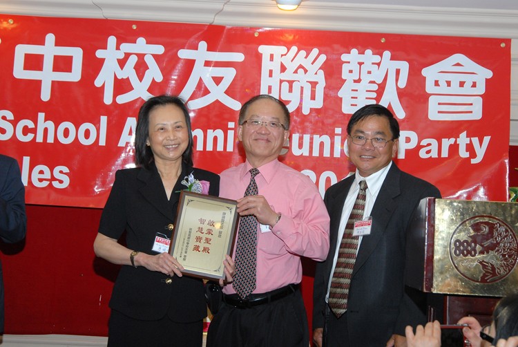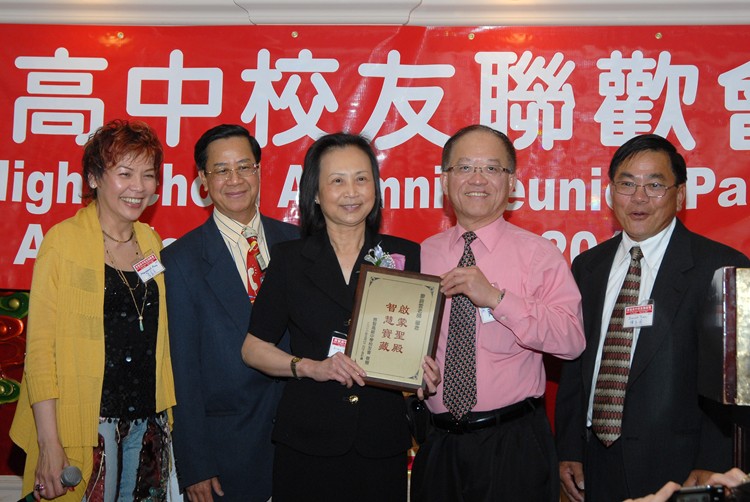 #91 1969年畢業校友韓蓮美代表大會贈送紀念獎牌給梁景輝老師。韓蓮美校友是此次聯歡晚會的發起人與主持人之一。